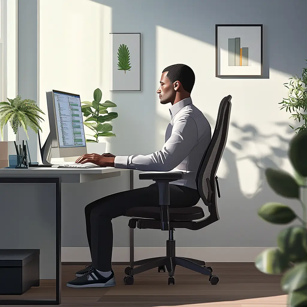 앉을 때는 목과 허리를 받쳐주는 인체공학적 의자를 사용하는 것이 좋아요.